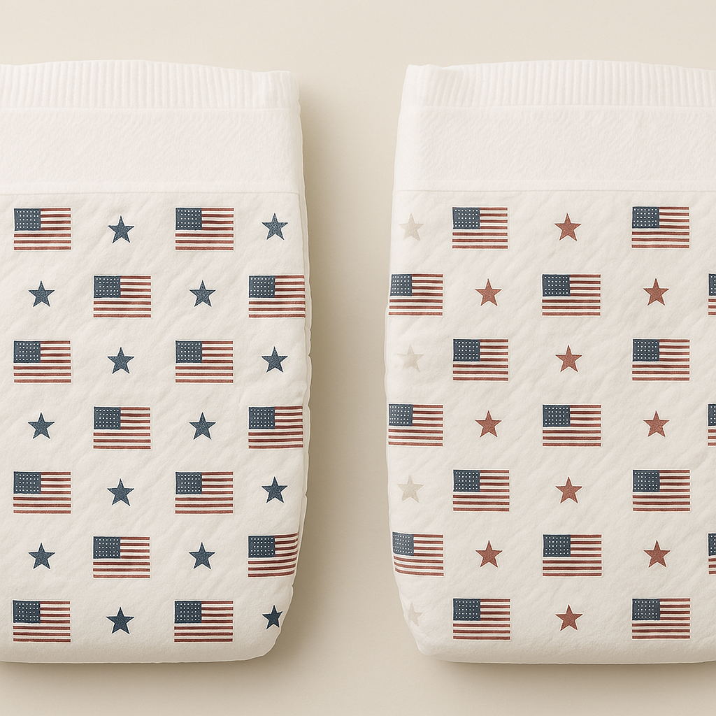 Our diapers are designed for comfort, printed with patriotic pride, and made in the USA.
